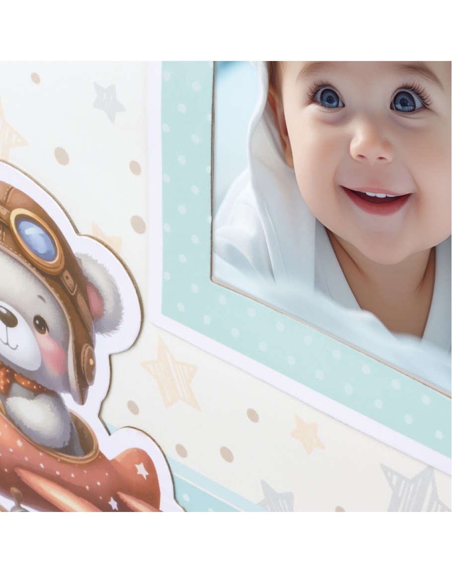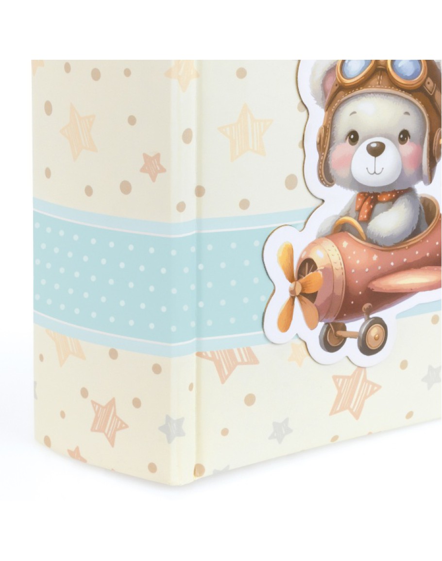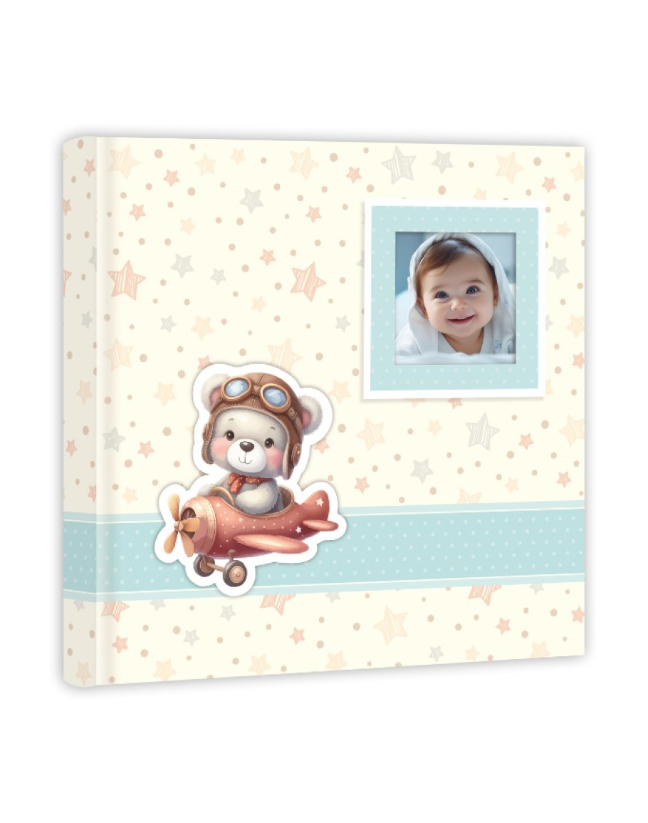 Традиционный детский альбом в книжном переплёте с обложкой из высококачественной ламинированной мелованной бумаги,с аппликацией в виде мишки с шариками. На лицевой стороне обложки есть вырез для личной фотографии. Размер альбома: 32x32 см, в альбоме 60 белых, не содержащих кислоты страниц, белые пергаминовые межстраничные листы,1 иллюстрированная нейтральная страница для записей. Для крепления фотографий необходимы аксессуары ( стикеры , уголки, клей). В одном альбоме можно совмещать разные форматы фото. Альбом упакован в коробку.