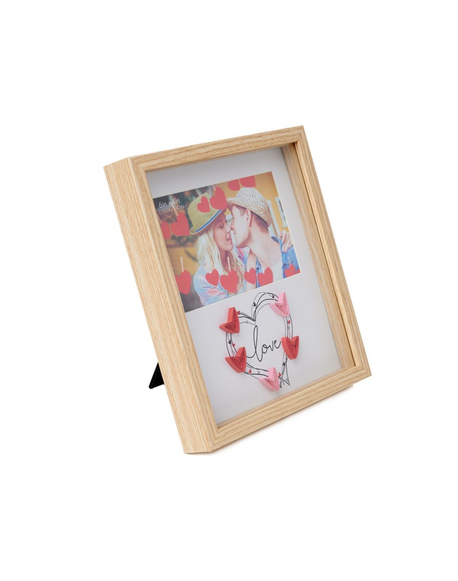Элегантная рамка для фотографий формата 10х15 см. Багет выполнен из МДФ, древесного волокна – достаточно легкого и при этом прочного, долговечного и экологически безопасного материала. Украшением рамки являются пять сердец, сложенных из бумаги, которые располагаются под стеклом. Стекло прочное, толщиной 1.5 мм. Внешний размер рамки: 22х20 см. Задник из плотного листа оргалита фиксируется с помощью удобных поворотных зажимов. Рамка упакована в подарочную крафт-коробку.
