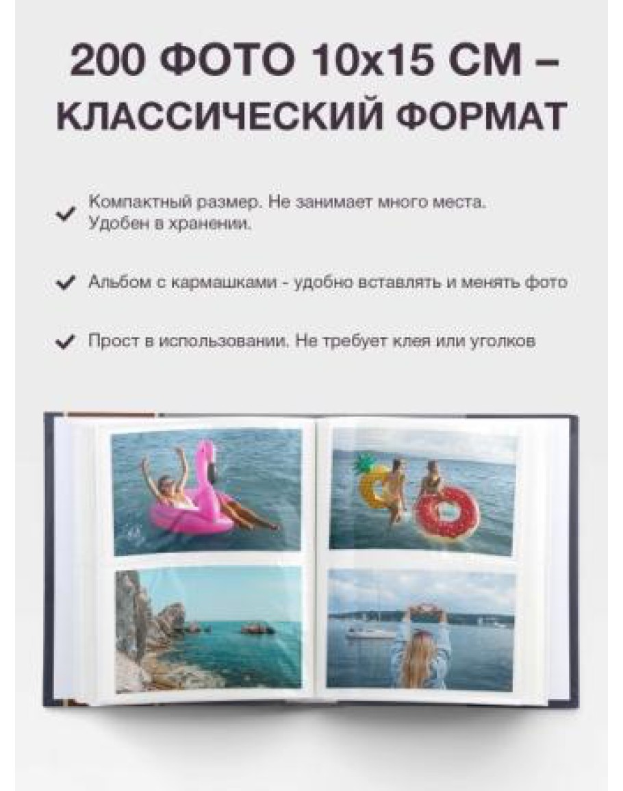 Альбом с кармашками из прозрачной пленки для хранения 200 фотографий 10х15см. В них фотографии защищены от грязи и пыли, есть возможность со временем поменять фотографии местами. Места для подписи отсутствуют. В таком фотоальбоме можно легко разместить все фотографии, подходящие по размеру формата кармашка. Картонная обложка, материал страниц - полиэтилен.