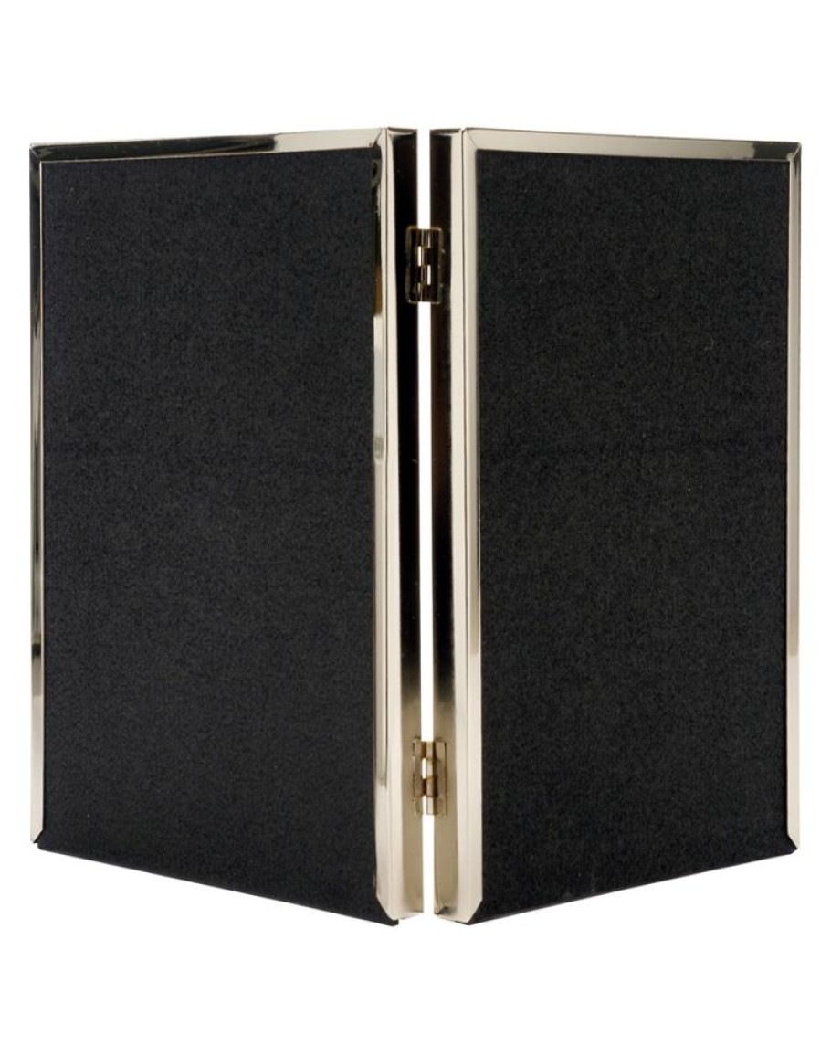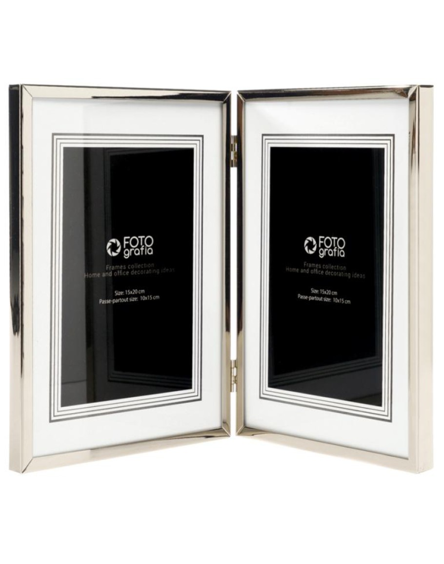 Премиальная металлическая рамка для двух фотографий формата 15х21 (или 10х15 см с паспарту). Поверхность багета глянцевая, зеркальная, стекло органическое (пластик). Задник из плотного листа оргалита. Ножка отсутствует: рамка самостоятельно стоит на ровной поверхности при складывании под небольшим углом.