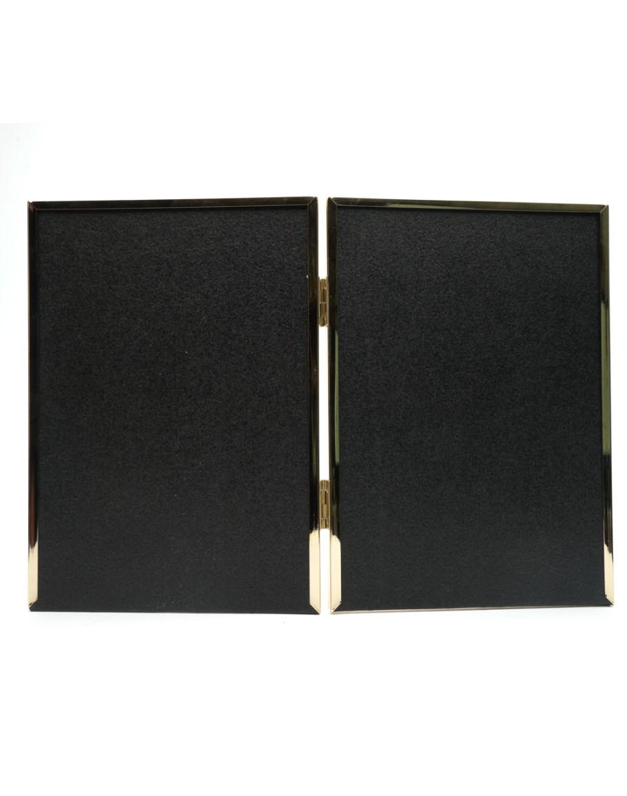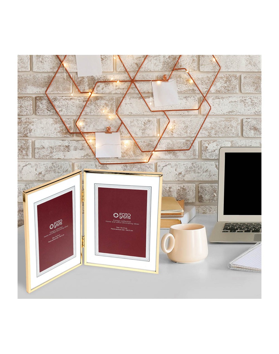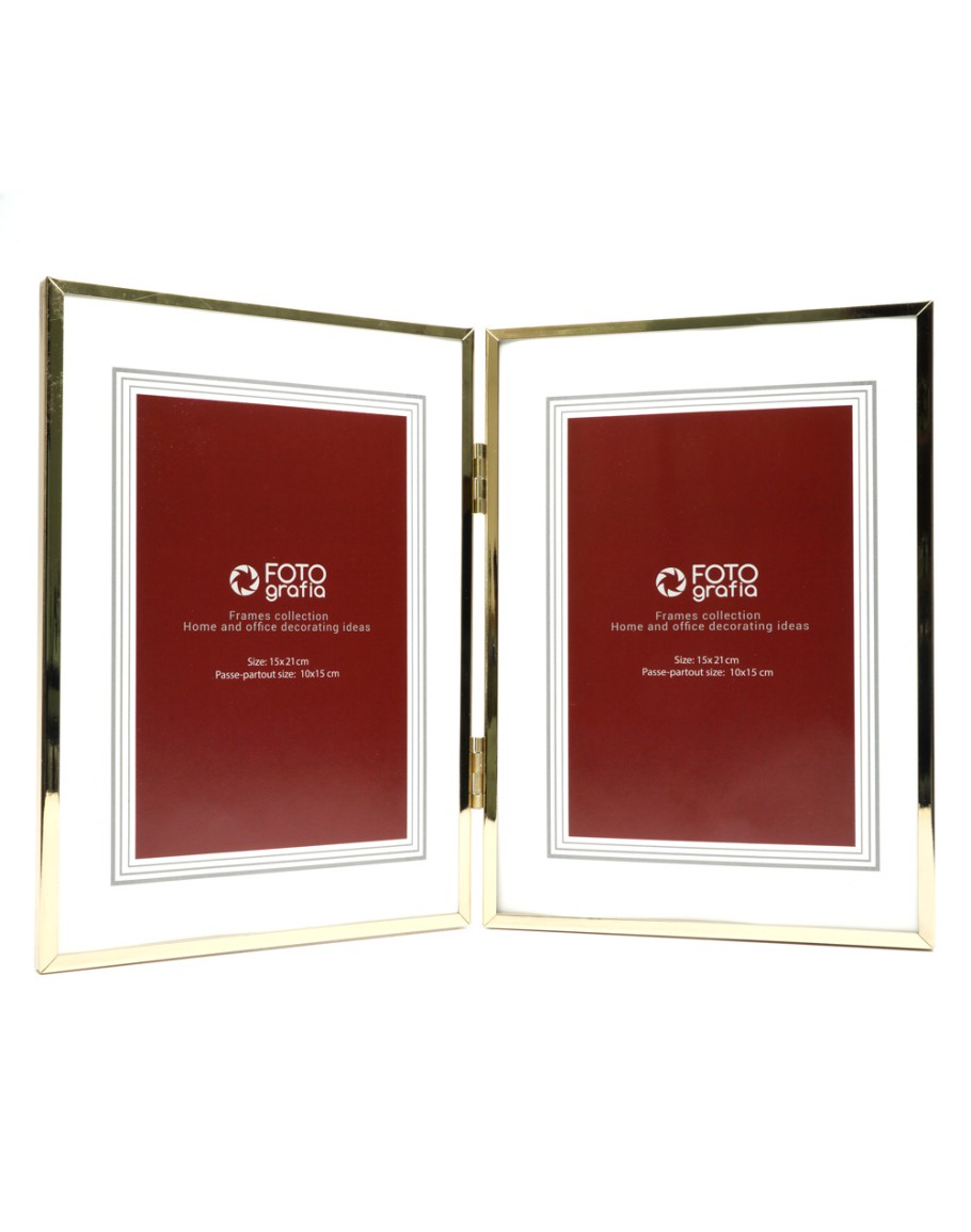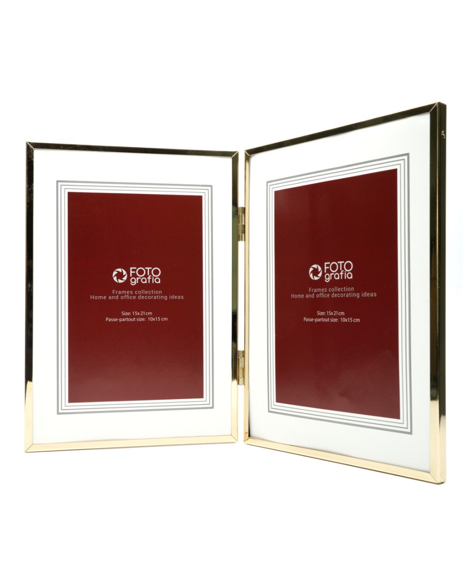 Премиальная металлическая рамка для двух фотографий формата 15х21 см. Поверхность багета глянцевая, зеркальная, стекло органическое (пластик). Задник из плотного листа оргалита. Ножка отсутствует: рамка самостоятельно стоит на ровной поверхности при складывании под небольшим углом. Внутренние вставки можно использовать в качестве паспарту для двух фотографий 10х15 см.