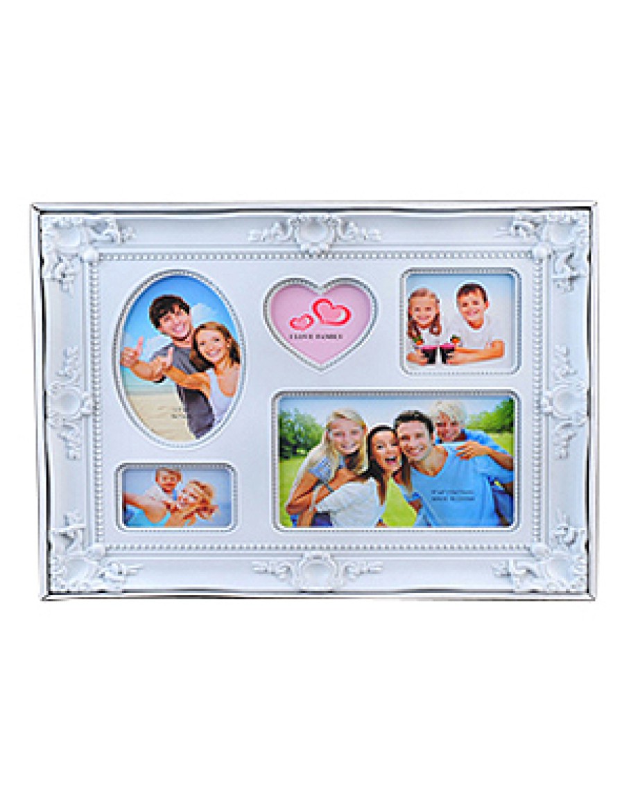 Пластиковая мультирамка на 5 фотографий: 1 фото 5х7,5 см, 2 фото 7,5х7,5 см, 1 фото 9х13 см и 1 фото 10х15 см.